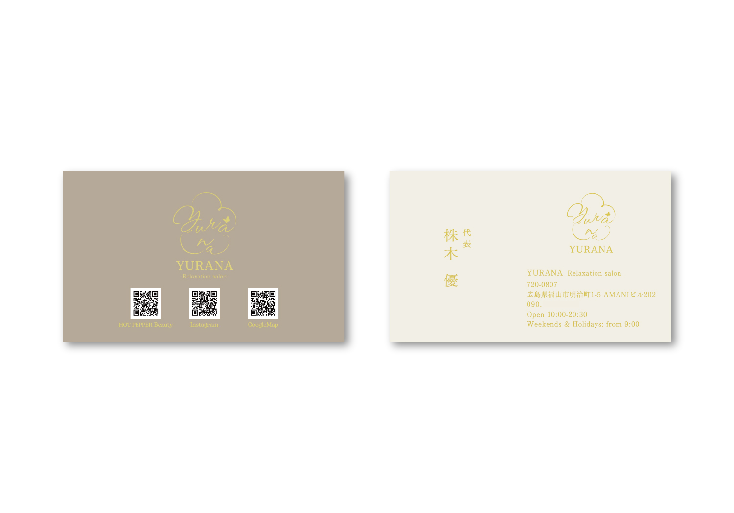 HOME WORKS YURANA -Relaxation salon-様 2026.03.5 カード類名刺 YURANA -Relaxation salon-様 COMMENT 福山市明治町にオープンされたYURANA様より、 予約カードと名刺制作のご依頼をいただきました。 ロゴの雰囲気に合わせ、やさしく温かみのあるデザインに仕上げております。 名刺は両面に金の箔押し加工を施し、上品でやわらかな印象の仕上がりとなっております。 CATEGORY カード類名刺 ‹ nonfinito 様 ‹ previous WORKS